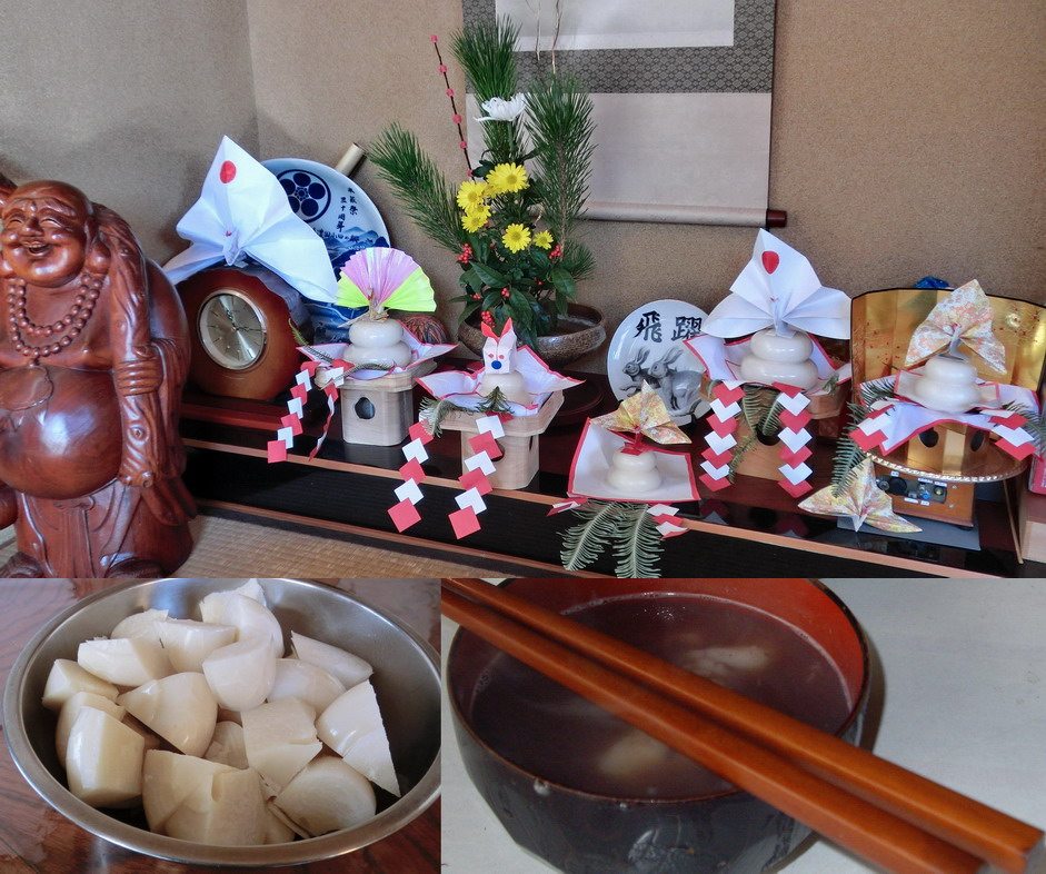 今では鏡開きは1月11日が標準であるが、我が家では1月8日と決めて行った。妻は或会で1月9日で行うのに合わせたものである。ところで去年までは餅の解体に苦労したが餅の裏に解体方法が印刷されてあるので、此に従うと簡単に解体できた。その方法は餅を暑い水に浸して1分ほどしてから切るといううものである。切るのは古式に従わず包丁を使うが拘ることは無い。古式では切腹を連想する刃物は使わないそうであるが現代では当然のことである。テレビで見る大型の餅も鉈や押切りカッターで解体していた。兎も角 去年の苦労が嘘のようである。