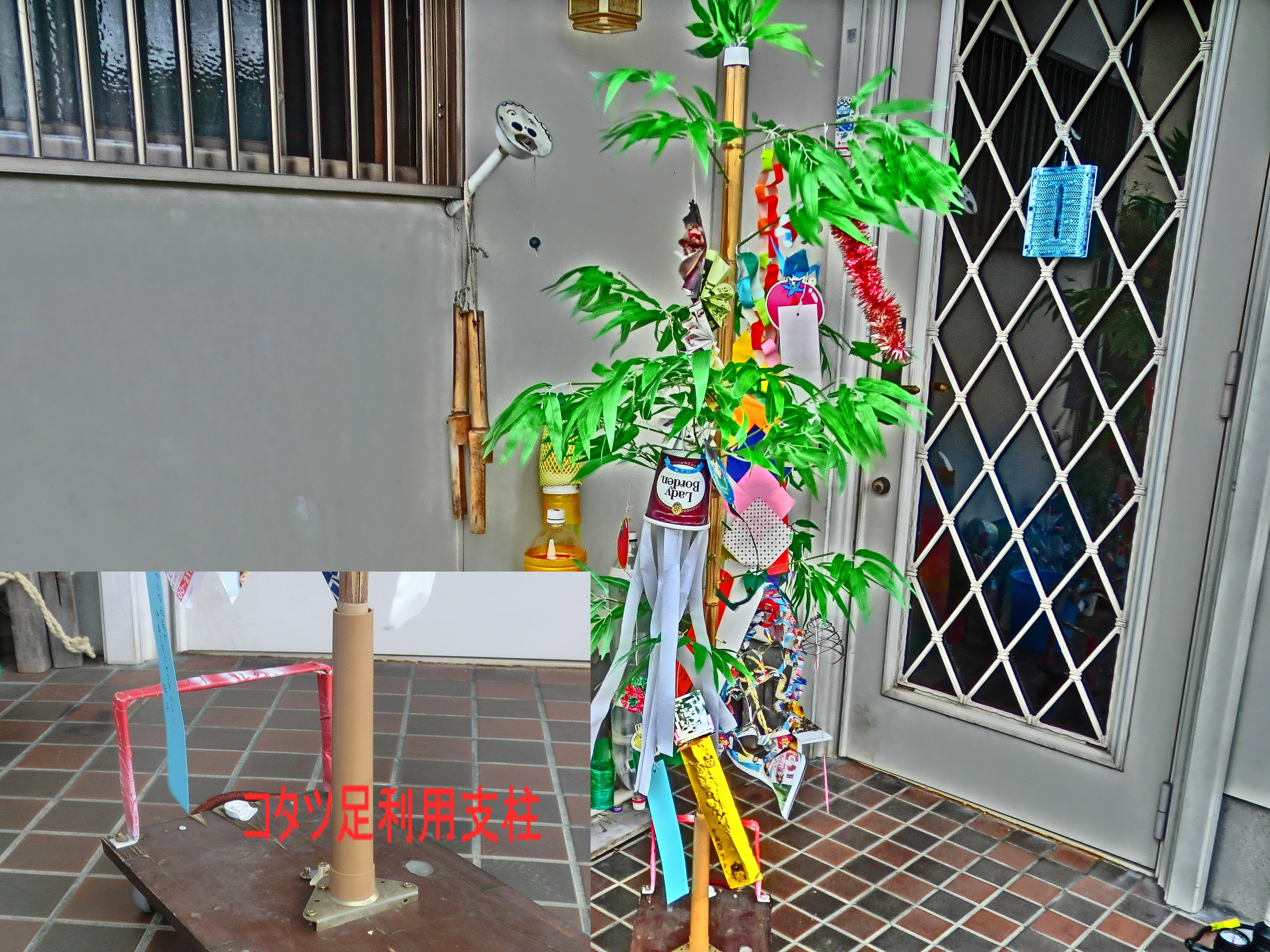 七夕飾りを飾る季節となったが、隣の市の公共施設の笹竹が不足してもらえない。仕方なく合成樹脂の笹竹を使用する事になった。去年のように移動式のものを製作するつもりでいたがコンクリート製のもの安定性は高いが やはり重い。そこで物干し台のコンクリートベースを止めて軽量のものとすることにしたが なかなか見つからない。しかし遂に最適なものを見つけた。夏には使用しない電気コタツの足である。コタツ足の中空部分に竹を差し込んで使用するものである。冬になれば七夕飾りは要らないのでコタツ足を修復すれば良い。これを見つけるのに3日ぐらいかかってしまった。結果は上々で軽量で移動便利である。