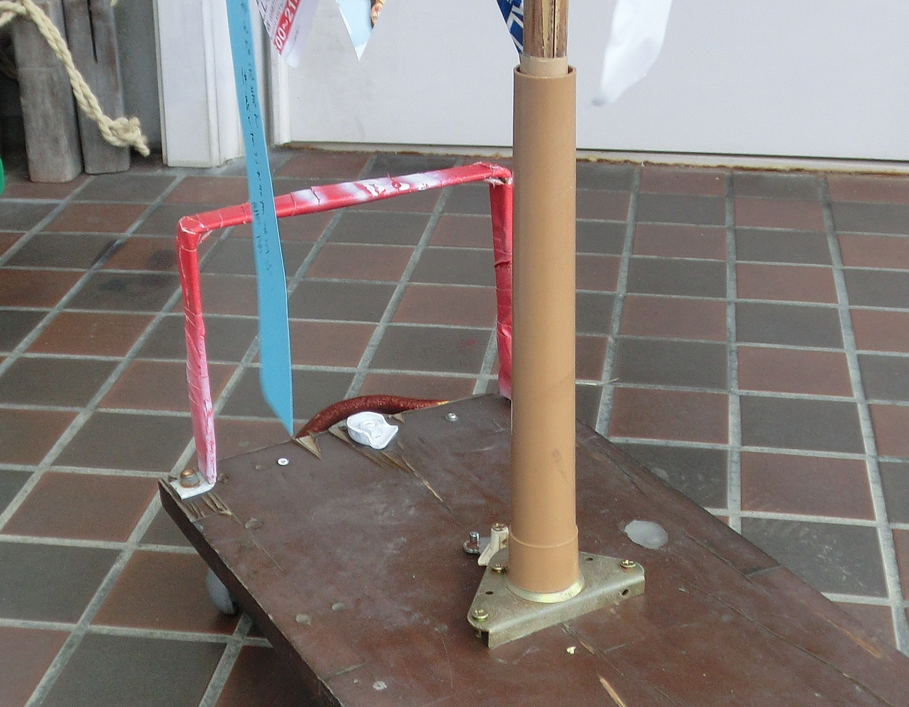 It was a season to display a Star Festival decoration, but a small bamboo of the public accommodation of the neighboring city does not have you be short. I will use the small bamboo of the synthetic resin unwillingly. I intended to produce a mobile thing like last year, but the concrete thing stability is high, but after all is heavy. Therefore it was decided that I turn off the concrete bass of the balcony for drying clothes stand, and it is said that I am lightweight, but is not readily found. However, I found the most suitable thing at last. It is the foot of the electric kotatsu not to use in summer. It comes in and uses bamboo for the hollow part of the kotatsu foot. If it is winter, the Star Festival decoration should restore a kotatsu foot because it does not need it. It has taken around three days to find this. The result is excellent, and movement is convenient at light weight.