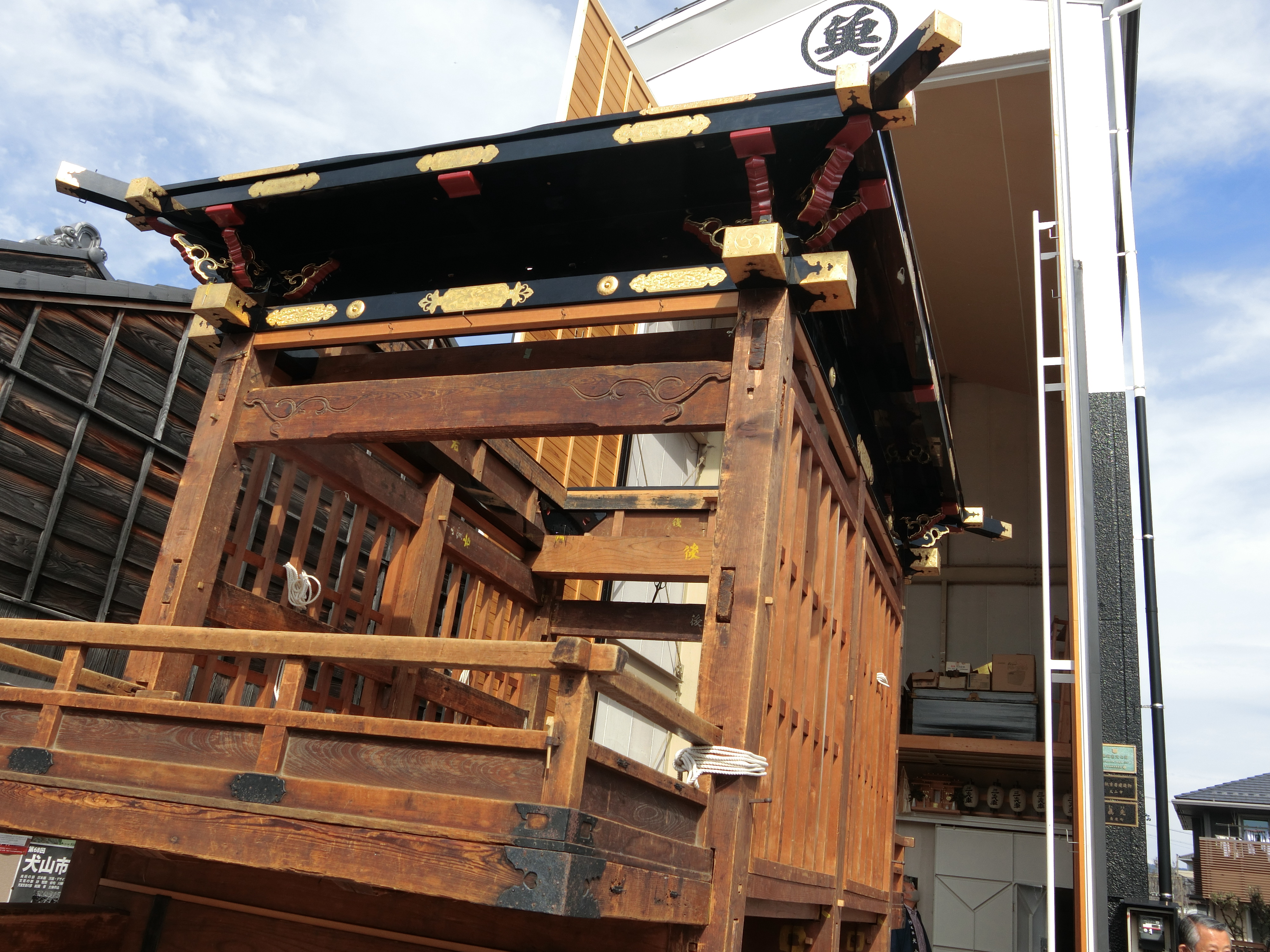 Reduced a scale, and the Inuyama festival was held last year, but normal this year; became held. Therefore my couple aimed at Inuyama-jo Castle by bicycle. I left a bicycle at the bicycle parking lot of the drugstore of MotoSimizuya on the way and I sat on foot in the precincts of the Inuyama Shinto shrine in front of street Inuyama-jo Castle via Dekimachi, Honcho and ate a lunch. The lunch became full with two big vinegared rice rolled in dried laver rice balls with two people. Something like hang glider was viewed from a distance between trees to a cherry tree after it passed for a while. I thought that it should be regulated . Then I moved to the needle rope Shinto shrine area while looking at the festival car which soared. The shooting of "DondenGaesi" has failed by clumsiness of the camera operation here. I moved, but witnessed that the person who spoiled physical condition by heat was carried in an ambulance afterwards while enjoying the atmosphere of the crowd. We were able to come home safely.