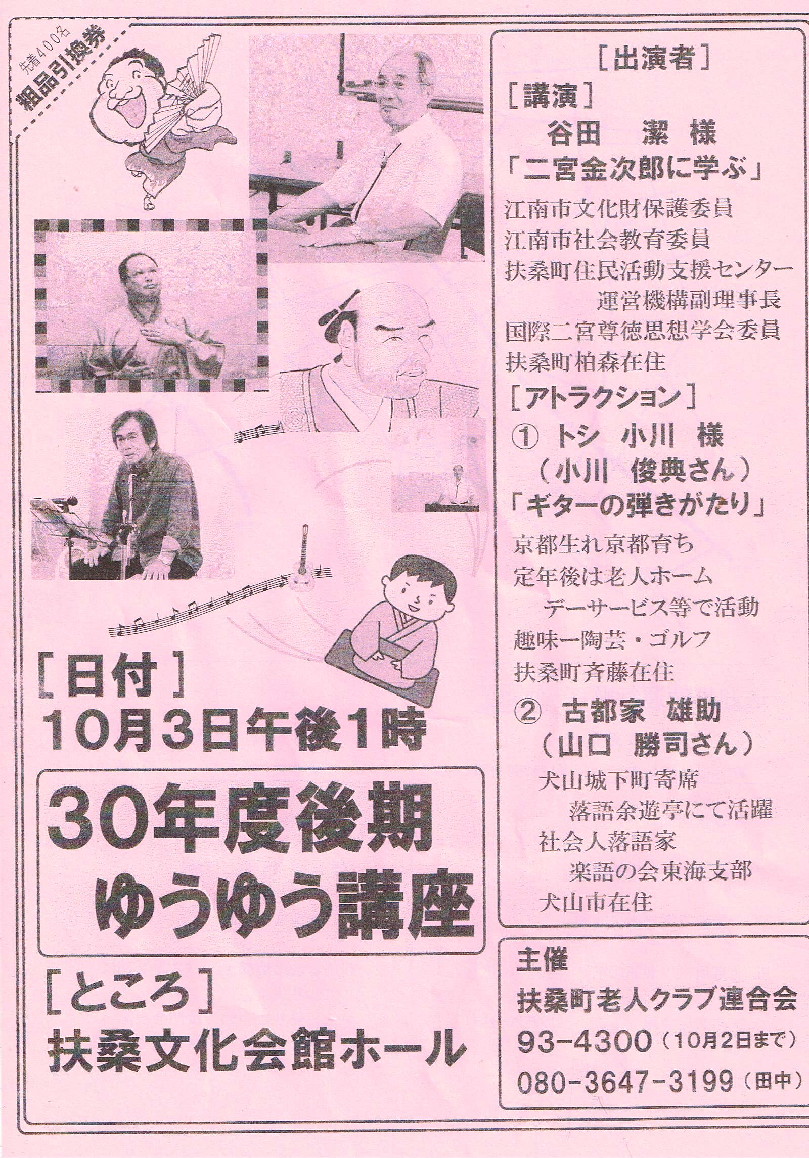 The population of our country becomes less than 100 million in 2050, and it is impossible to stop the social aging. 1/4 of the population is more than 65 years old now. There are a large number of old men in our town, and association of Fuso golden age club society exists for the welfare. And holding is considered to be it a lecture leisurely twice a year. It is the first lecture today. Three lectures were content. As for one, as for story of the rearranging, two, Chinese instrument with two strings and performance of a short koto and the piano, three were a song of and games of 26 preschoolers during the lifetime. I think that the performance of three people was good for me. I want to expect it for an event of the latter period of this year.