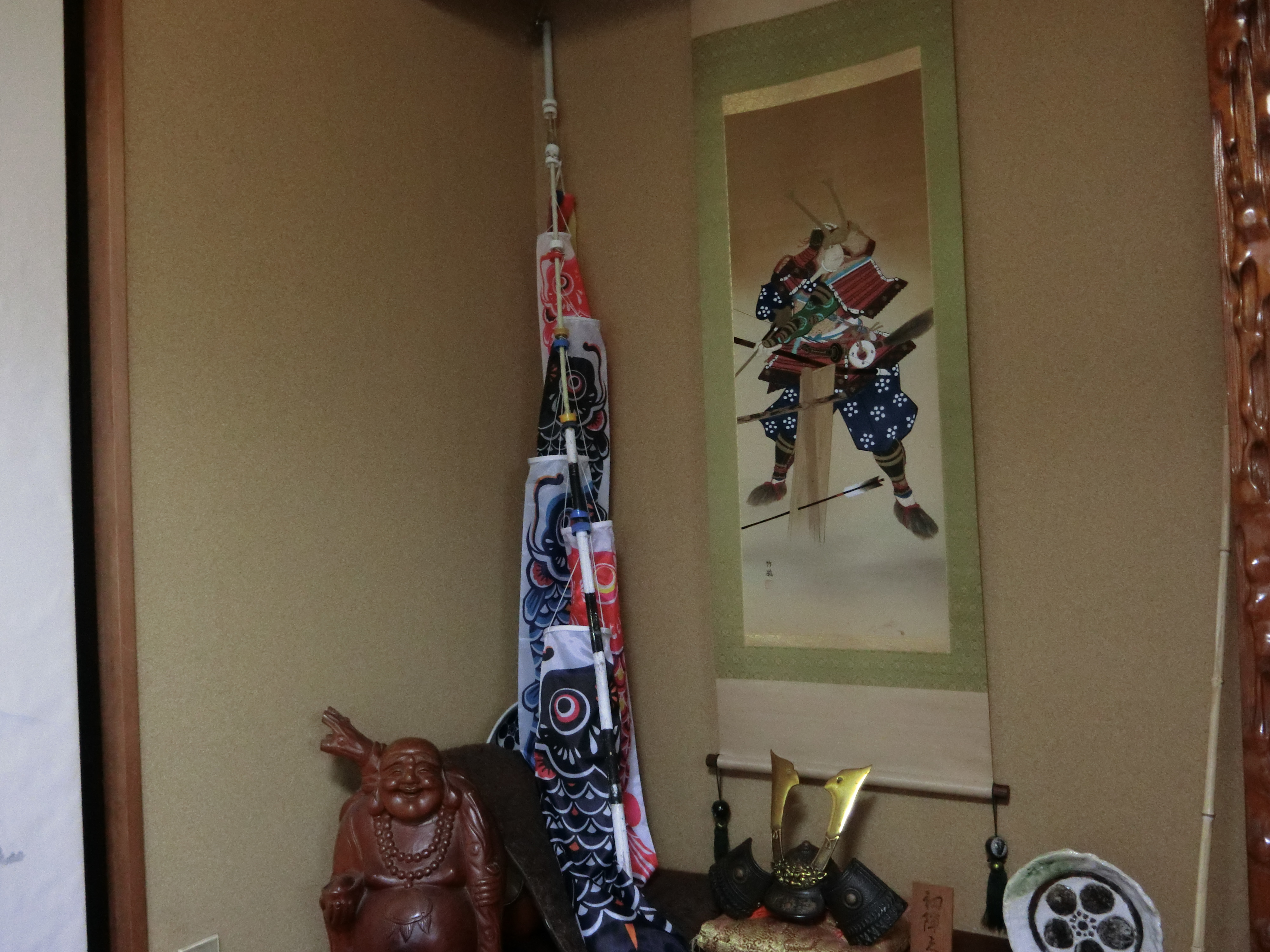 鯉幟の補修のために新しい鯉幟シートを買ってきた。古い鯉幟は破れたのを裁縫で補修せず、すべて廃棄した。一番上の孫が今は高校生であり、孫が3歳ころであるから、10年以上使用したわけである。今回の補修は鯉幟シートを事務用のカードリングに連結して支柱に止める方式を採用した。ペットボトルのキァップ蓋に穴を開け、これを2個で一組として支柱に間隔を置いて挿通した。私は出来具合に満足して眺めていると、通り掛かった女のこが「ここの家には子供が居ないのに」と言っている。私は、一切気にしないことにしている. Repair of the carp streamer I bought a new carp streamer sheet for the repair of the carp streamer. The old carp streamer did not repair what was torn by sewing and discarded all it. Because the biggest grandchild was a high school student now, and a grandchild was about 3 years old, I used it more than ten years. I adopted a method that this repair connected a carp streamer sheet with a card ring for office work and left to a prop. I made a hole in a cap lid of the plastic bottle, and I put an interval to the prop for one set in two, and pierce it did this. When I look in content with effect, the girl who happened to pass says, "there is not a child in this house". It is a custom not to mind me at all. Reparatur von Karpfen-streamer Ich kaufte mir ein neues Karpfen-Streamer-Blatt für die Reparatur von Karpfen-Streamer. Der alte Karpfen-Streamer nicht reparieren, was war hin-und hergerissen durch Nähen und verworfen alle es. Denn das größte Enkelkind ein Gymnasiast jetzt war, und ein Enkelkind ca. 3 Jahre alt war, habe ich es mehr als zehn Jahren. Ich nahm ein, dass diese Reparatur ein Karpfen-Streamer-Blatt mit einem Karte-Ring für Büroarbeit und Links, um eine Stütze verbunden. Ich habe ein Loch in eine Kappe Deckel Kunststoff-Flasche, und die Stütze für ein Set in zwei und Pierce es tat dies ein Intervall gesetzt. Wann sehe ich inhaltlich mit Wirkung, das Mädchen, das passiert übergeben sagt, "Es ist kein Kind in diesem Haus". Es ist ein Brauch nicht zu mir überhaupt nichts dagegen.