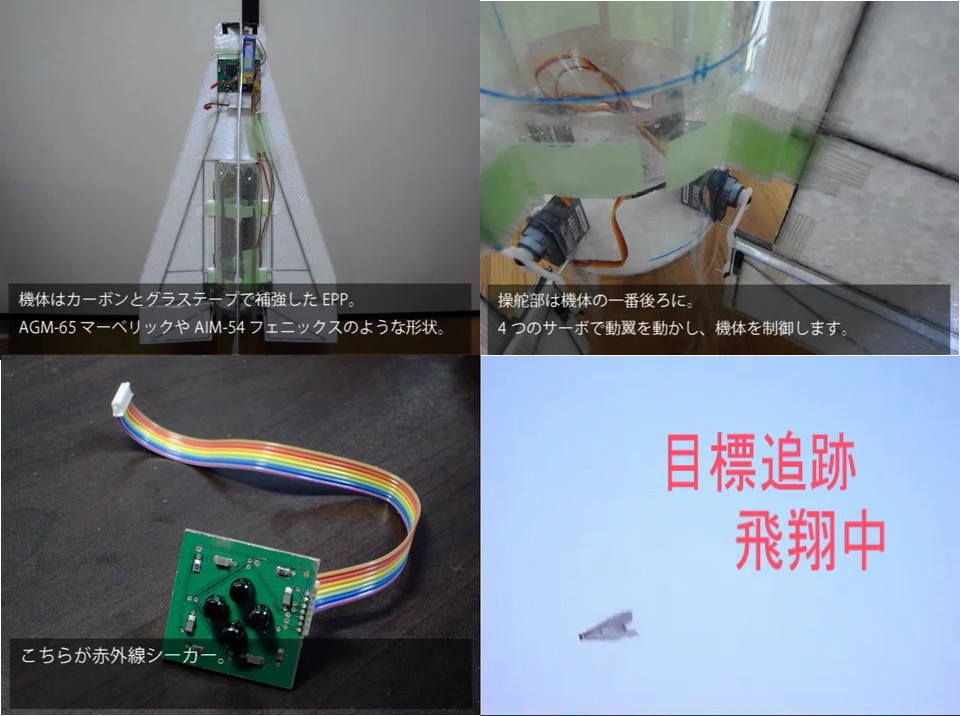 10月7日に各務原市で航空宇宙博物館主催の水ロケット祭が開催されたものを見た。去年よりエントリー数は減ったが3段式のものが出ていたが高度がでなかった。2段目、3段目の切り離しは成功していたが初段目の高度が出ず姿勢が倒れて横方向に飛んでしまった。3本構成のクラスター方式のバランスが悪いと推定される。従って初段もペットボトル1本の方が良い結果をもたらすと思われる。次に飛行機型のものは約1m程の飛びで終わった。ロケットと飛行機では推進方式が異なるので飛行機に高速始動のペットボトル推進は無理がある。10月7日に帰宅してからYOUTUBEでミサイル型の水ロケットを見つけた。操舵はRCで赤外線を感じ取る十時に仕切られたシーカーを先端に装着したものである。この水ロケットは赤外線を放出する目標に飛行する。後尾の十時配列の4CHサーボで操舵を行っている。赤外線誘導ミサイルそのものであって、カメラも備える。簡易通信モジュールXbeeを搭載したマイコンRX62Nの目標追跡のプログラムも加速度、地磁気、角速度を考慮した2500行もある。これらは 私には難しい。でも研究する価値はある。